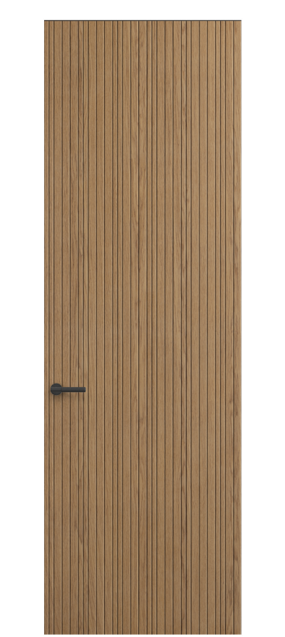 SELECT — коллекция минималистичных дверей с фрезеровкой по натуральному шпону. Рельеф на поверхности полотна создаёт игру света и тени, добавляя пространству динамичности и визуального объёма. Двери SELECT в сочетании со стеновыми панелями и мебельными фасадами, повторяющими лаконичный дизайн, создают единое стилевое решение.